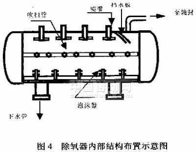 經旋膜器粗除氧的給水及由疏水管引進的疏水在這里混合進行二次分配,呈均勻淋雨狀落到裝到其下的液汽網上,再進行深度除氧后才流入水箱.水箱內的水含氧量低于部頒標準。